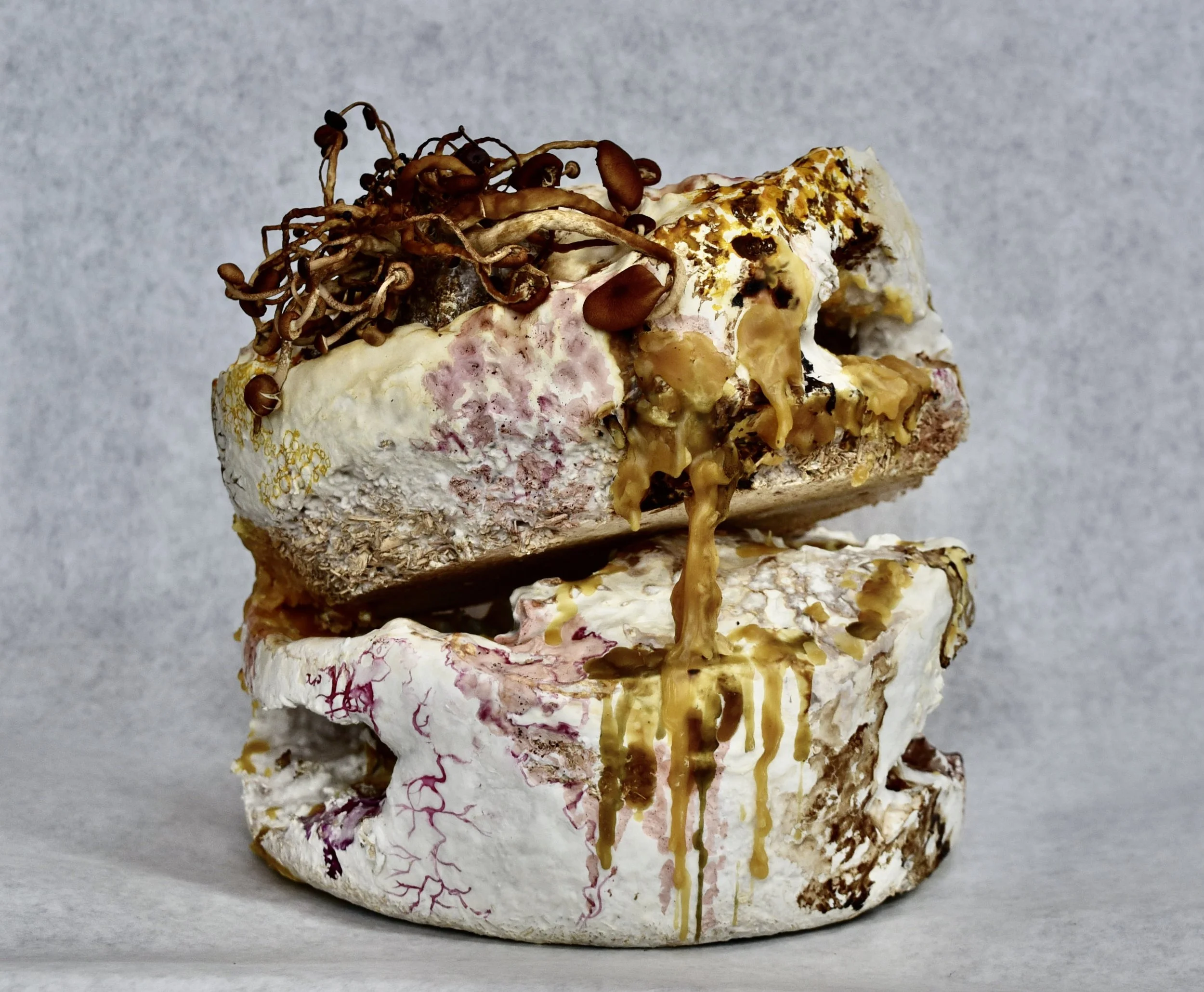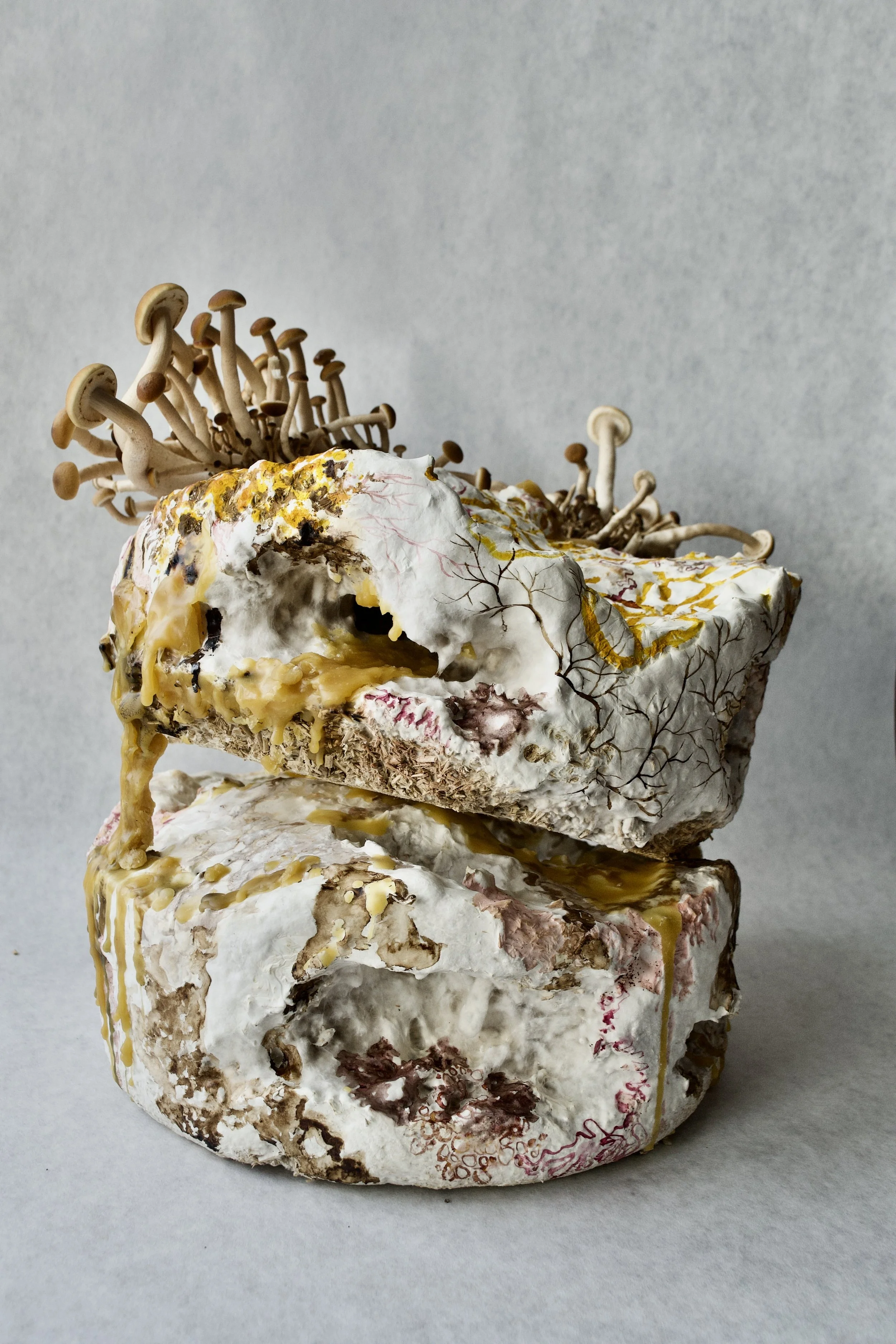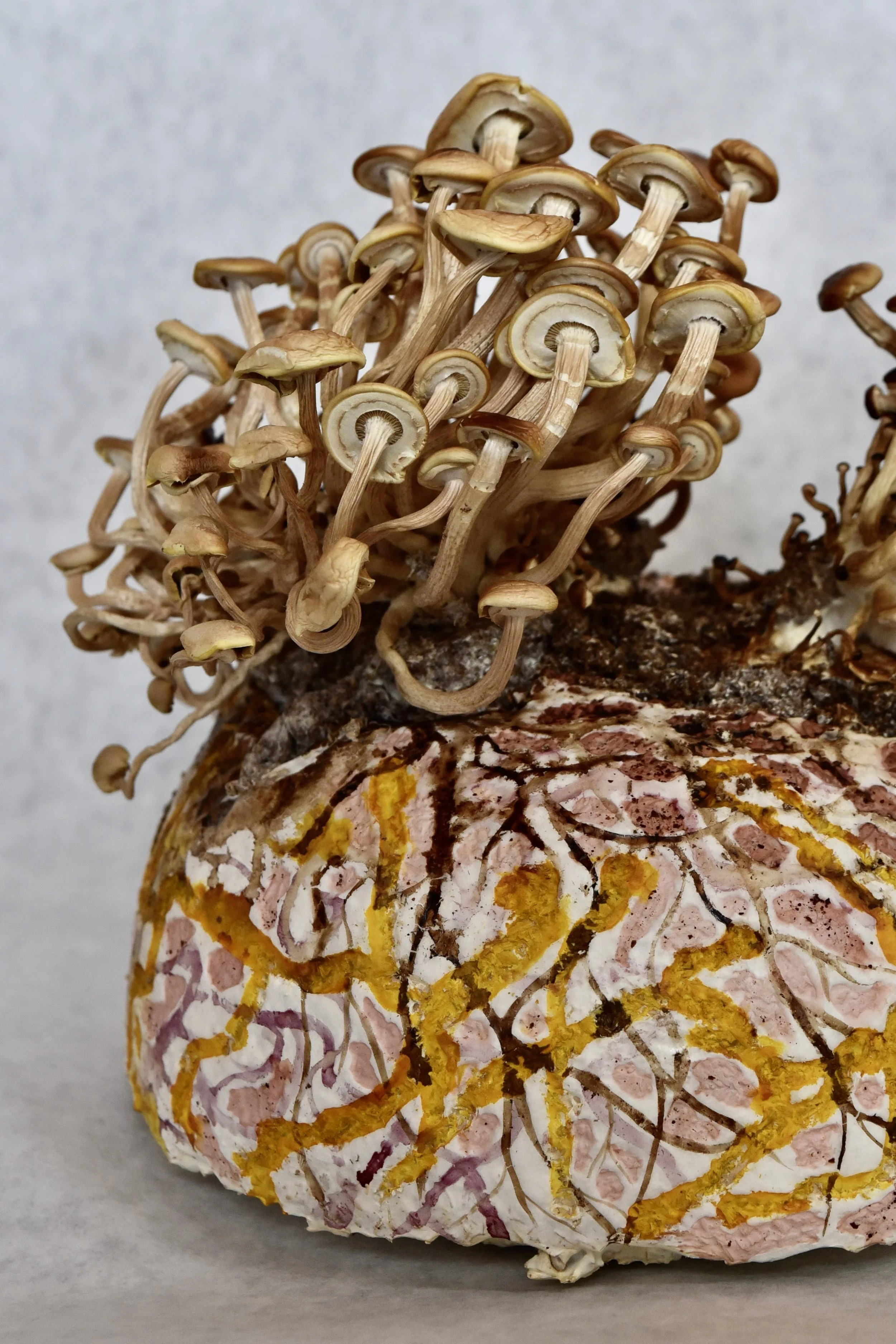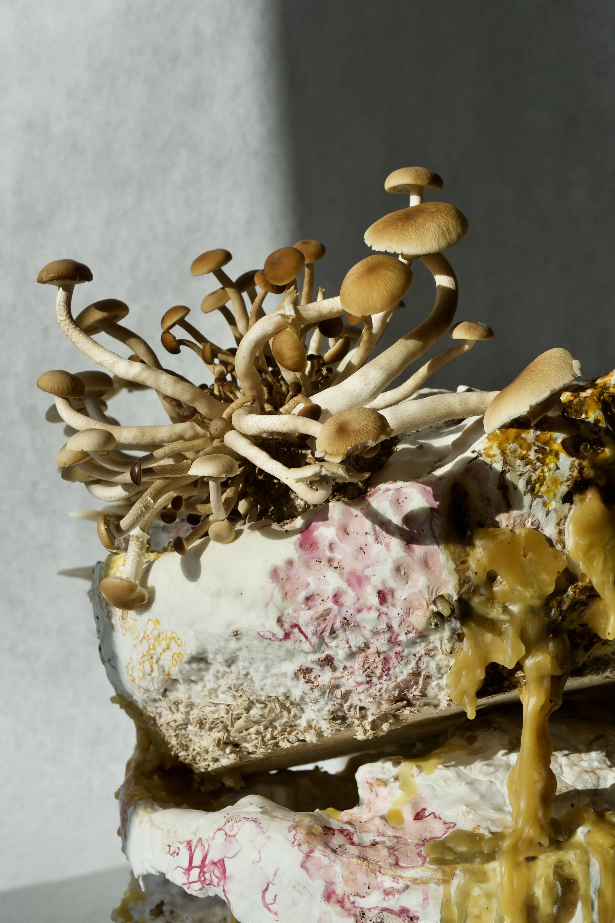 This work is part of a process-oriented project that explores a circular systems approach to living sculpture with an emphasis on de-centering the human position and allowing the central actor, fungi, to shape the work.